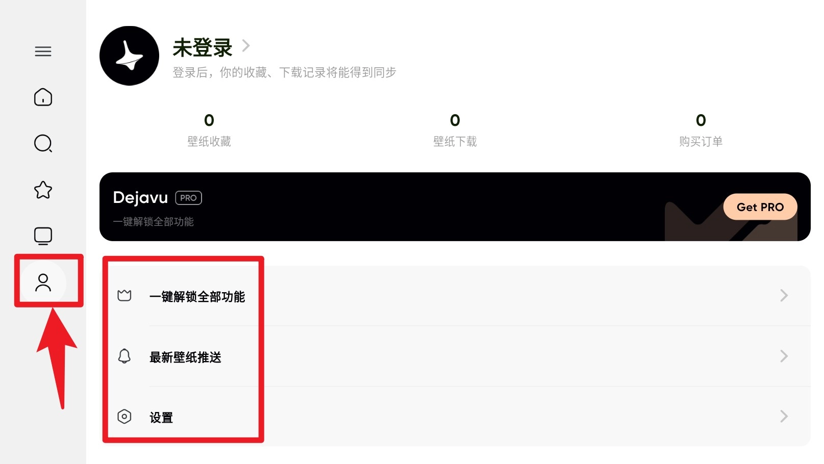 4. 點(diǎn)選左側(cè)個人中心圖標(biāo),可解鎖全部功能、開啟壁紙推送服務(wù),并進(jìn)行賬戶登錄或偏好設(shè)置。