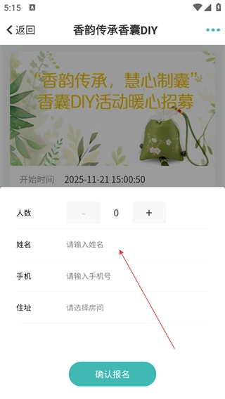 4、于報名頁面依次填寫人數(shù)、姓名、手機(jī)號、住址等相關(guān)信息,隨后點擊【確認(rèn)報名】按鈕,即可完成活動報名。
