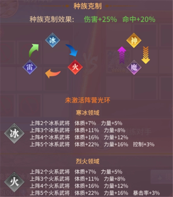武將分為冰、火、雷、神、魔五大系別,滿足特定條件后可激活相應(yīng)光環(huán),提升戰(zhàn)斗中的綜合屬性表現(xiàn)。