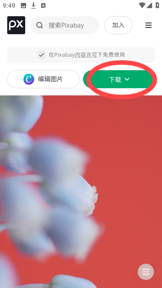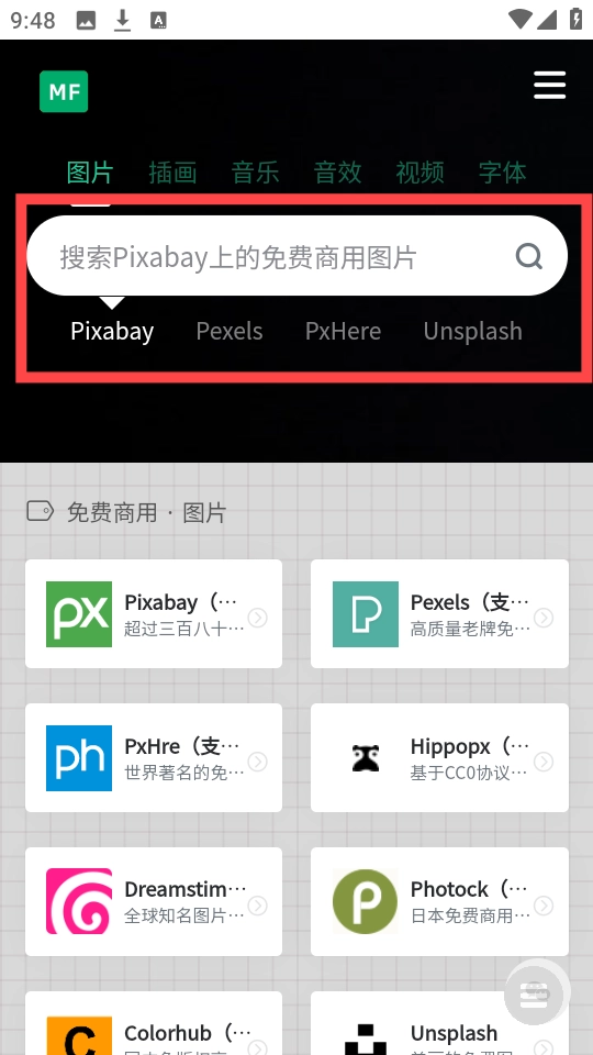 3、在頂部搜索欄輸入關(guān)鍵詞,比如要查找pixabay上免費商用的圖片資源時就可如此操作。