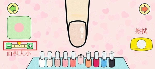 4、每個指甲都支持個性化上色,左側(cè)滑塊可調(diào)節(jié)點涂大小,右側(cè)按鈕用于擦除多余顏色
