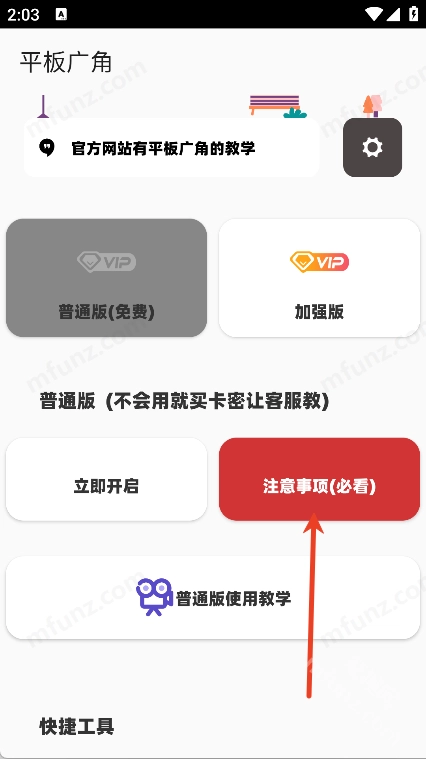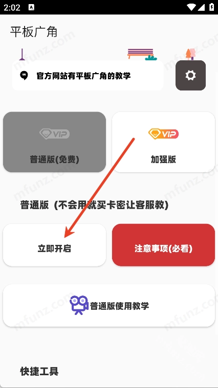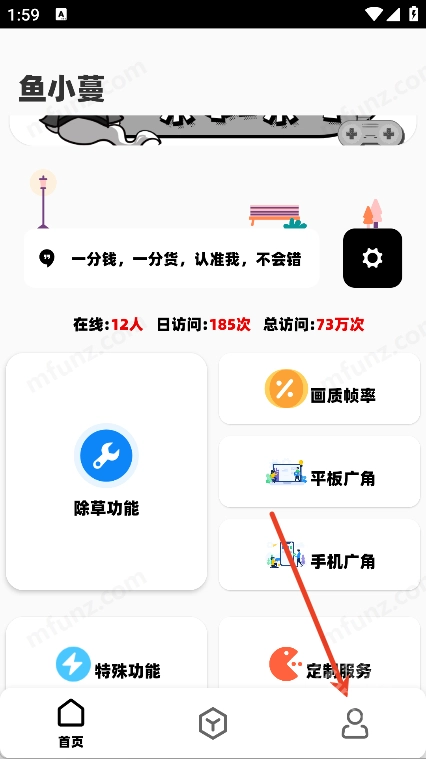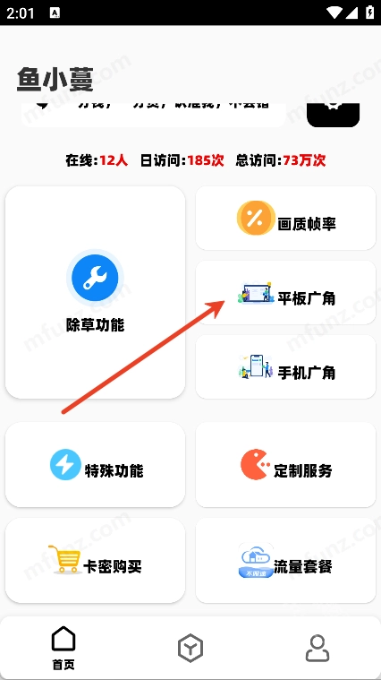 1. 打開(kāi)魚小蔓畫質(zhì)助手軟件,進(jìn)入首頁(yè)后點(diǎn)擊平板廣角。
