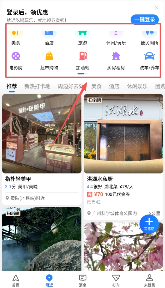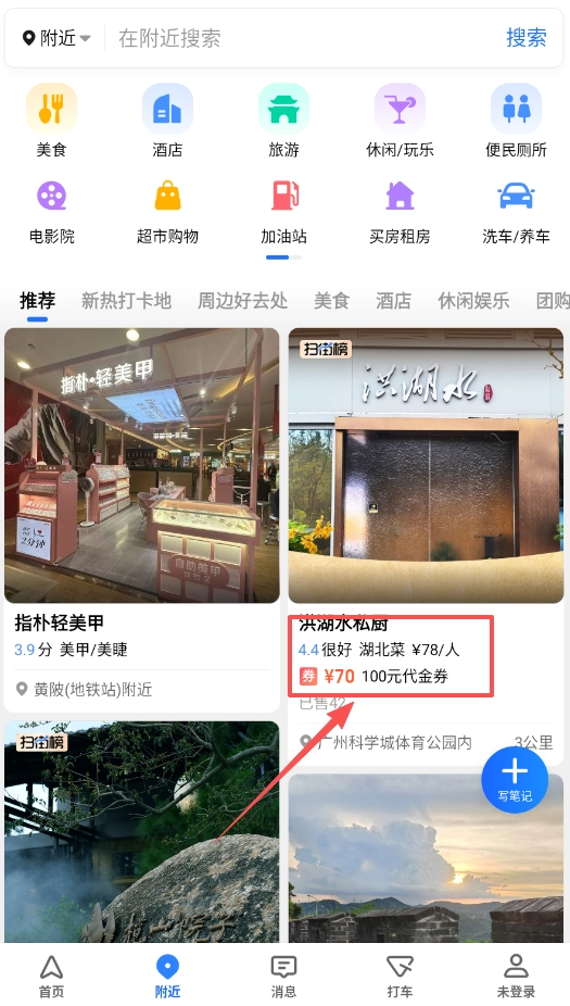 4、留意附近頁面里的推薦板塊,那里常有新熱打卡地和商家優(yōu)惠券,能省下不少錢呢。