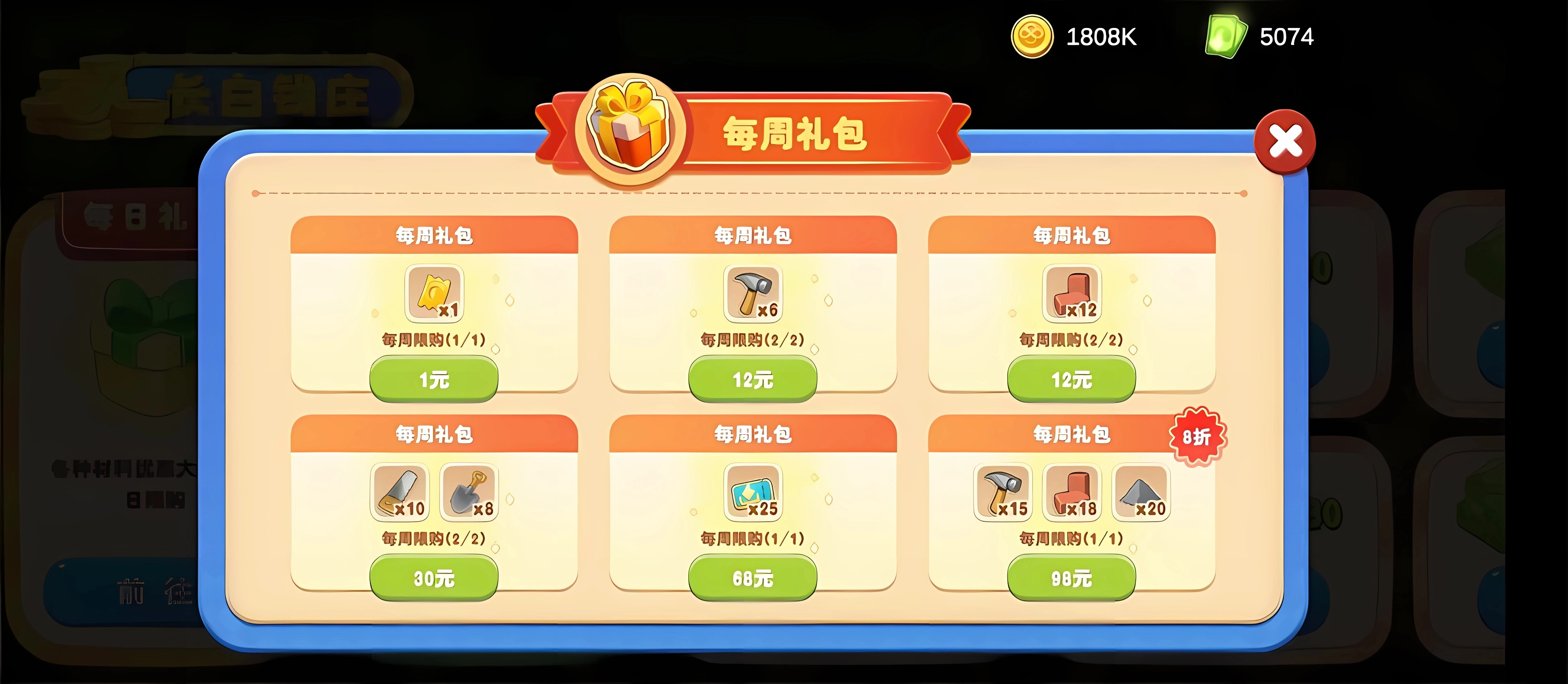 98元,8折優(yōu)惠大禮包 ,15個錘子、18個紅磚、20個水泥堆,全方位升級您的倉庫。