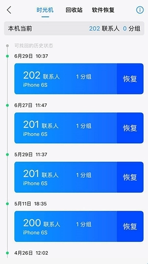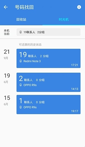 如果您的手機(jī)通訊錄錯亂或名片被誤刪,可通過點(diǎn)擊右下角【我的】菜單中,點(diǎn)擊【號碼找回】,即可找到“時光機(jī)”對手機(jī)通訊錄進(jìn)行恢復(fù),亦可在“回收站”中找到最近被刪除的聯(lián)系人,添加回手機(jī)通訊錄中。