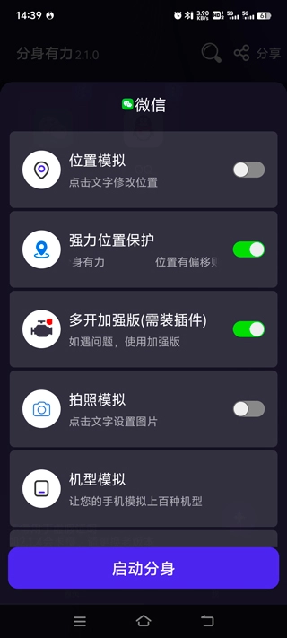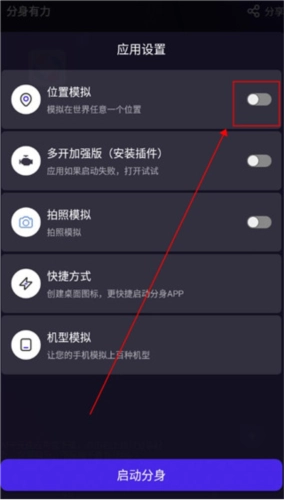 2、開啟“位置模擬”功能,隨后點擊“啟動分身”即可生效。