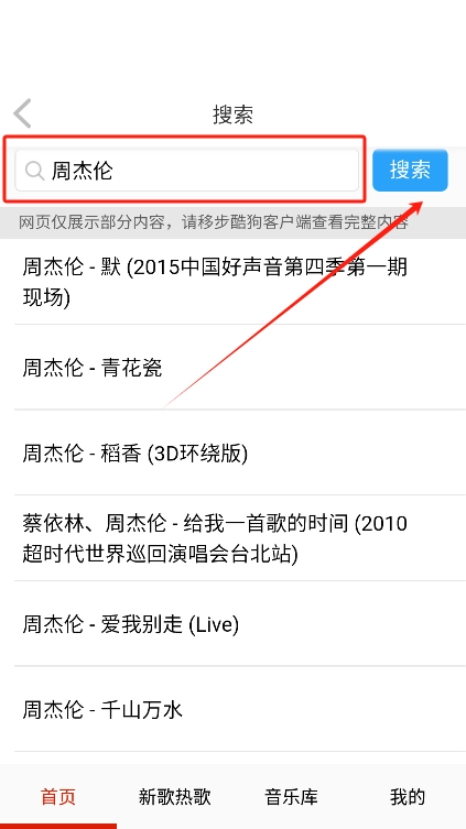 2. 在首頁或搜索欄輸入想聽的歌曲或者關鍵詞,點擊搜索。