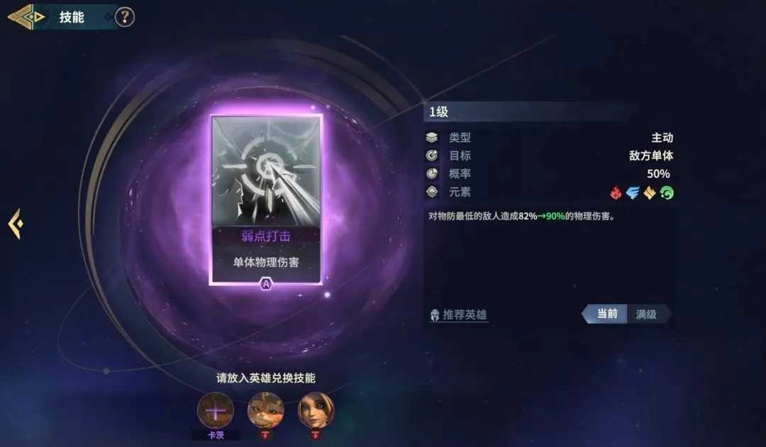 游戲內(nèi)每個(gè)英雄自帶普通攻擊、核心技能兩個(gè)技能。還可額外賦予兩個(gè)技能。分別在10級(jí)和20級(jí)解鎖