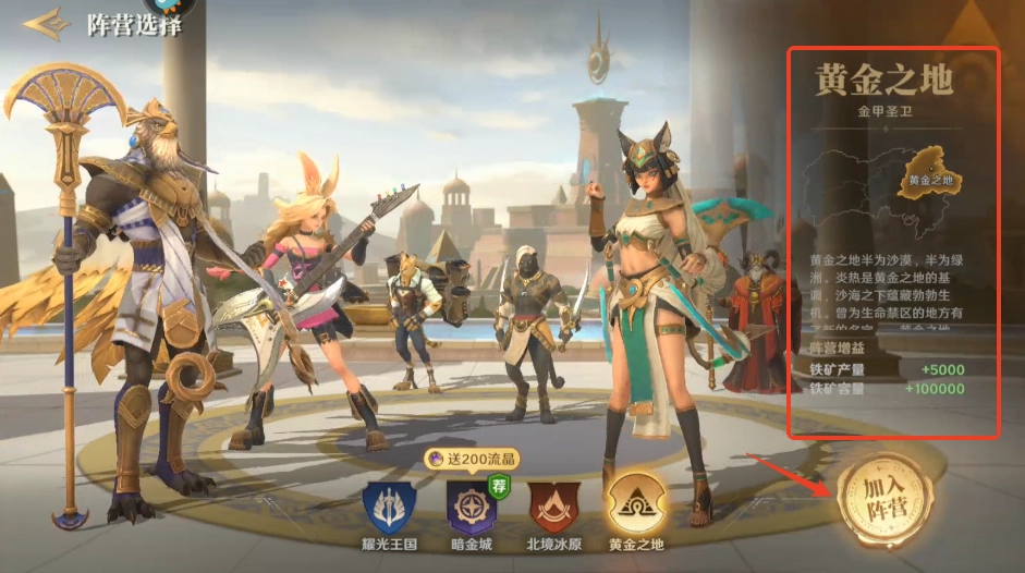6、這里做示范我們就直接選擇黃金之地了,當(dāng)然不是為了黃金去的,除了推薦之外贈(zèng)送的資源外,4個(gè)陣營(yíng)的初始資源都是一樣,并不會(huì)叫做黃金之地所以黃金會(huì)更多的情況。