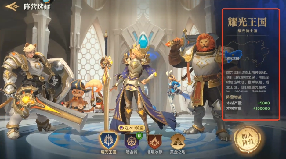 3、下方可以切換陣營(yíng),比如我們切換到曙光王國(guó),則是一個(gè)騎士風(fēng)格的陣營(yíng),從盔甲就能看出防御力應(yīng)該拉滿了。