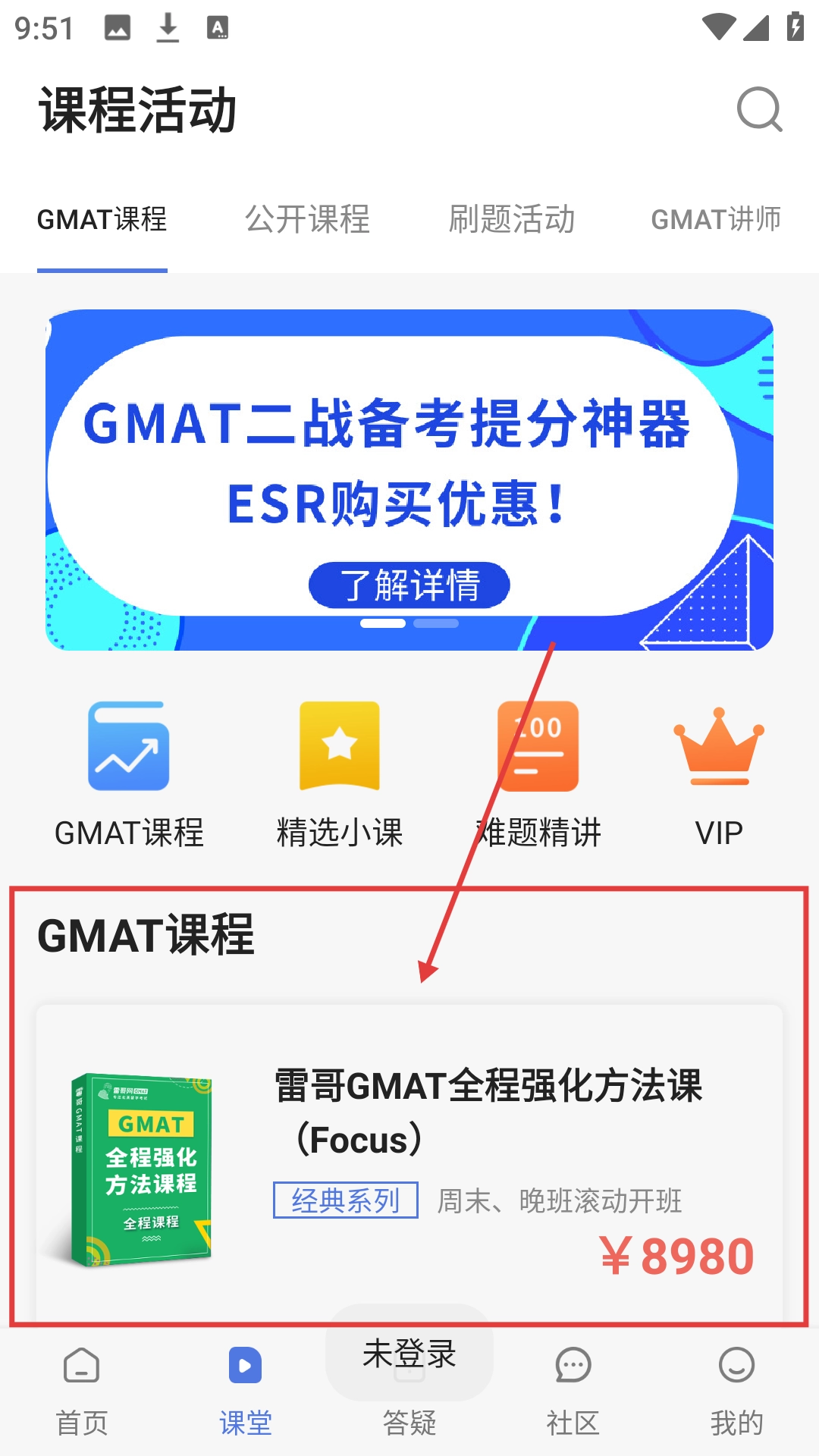 1. 輕點(diǎn)【課堂】,即可進(jìn)入課程活動(dòng)頁(yè)面,在這里能夠查看各類GMAT課程。