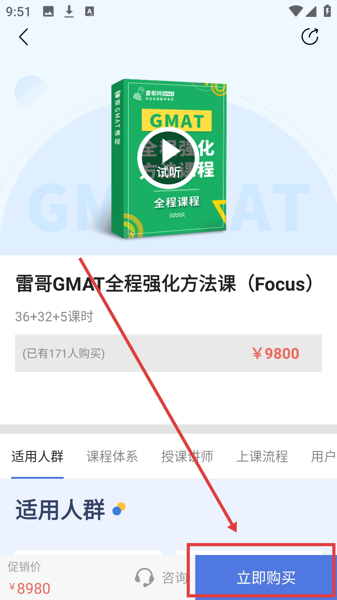 2、在課程活動(dòng)界面選【雷哥GMAT全程強(qiáng)化方法課(Focus)】,進(jìn)入課程詳情界面啦。