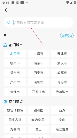 3、在城市搜索界面的搜索框中,輸入【想要查看天氣的城市】。