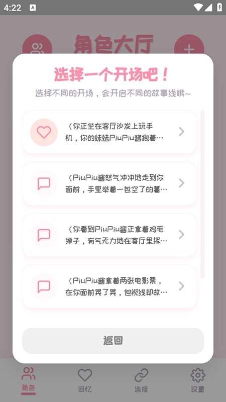 3、選擇喜歡的角色點(diǎn)擊封面,可以選擇一個(gè)開(kāi)場(chǎng)聊天。