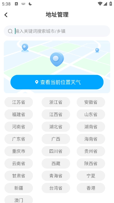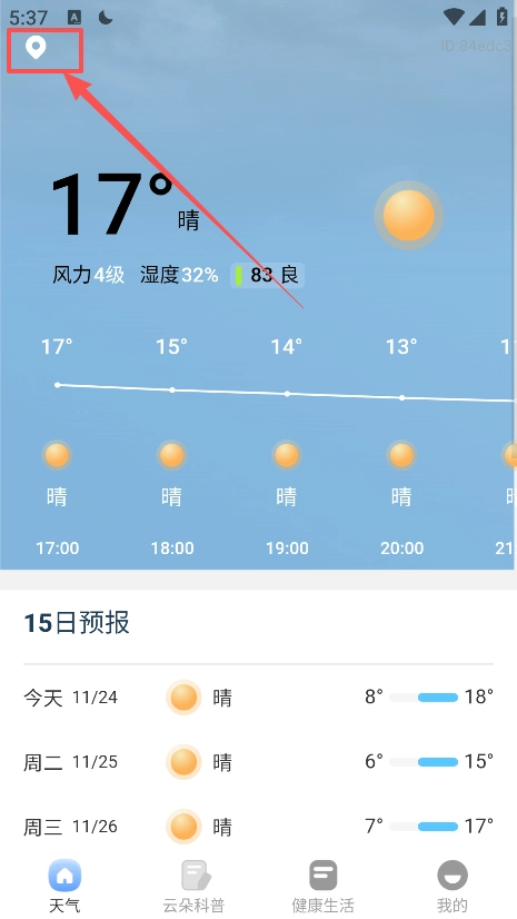 1、在天氣頁(yè)面點(diǎn)擊左上角的定位圖標(biāo)