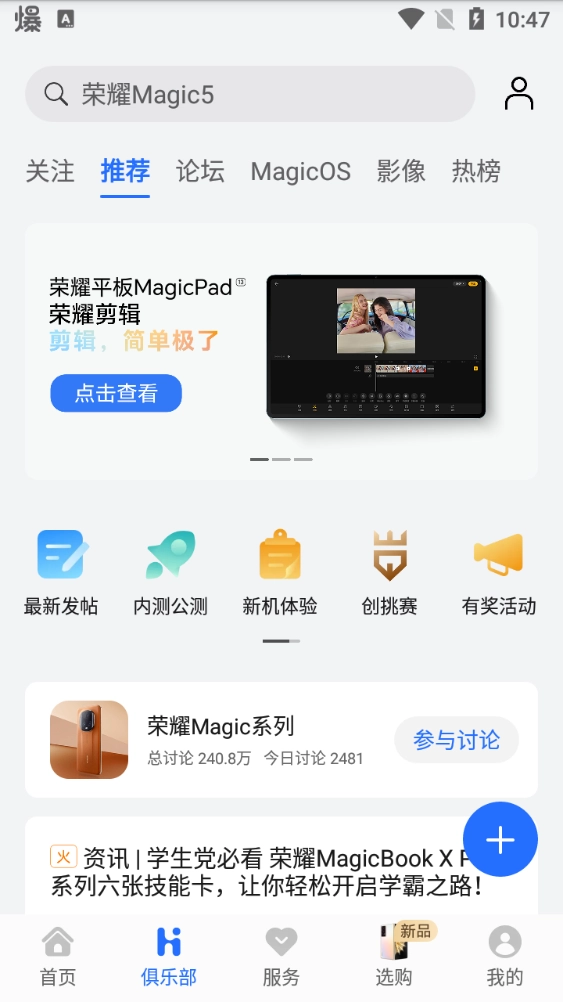 2、點擊【俱樂部】,可以搜索有關榮耀產品的帖子,也可以自己發(fā)帖,點擊旁邊的【+】即可;