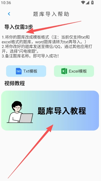 3、題庫導(dǎo)入可按照當(dāng)前頁面提供的步驟進(jìn)行操作,無論是使用Txt模板還是Excel模板均可。
