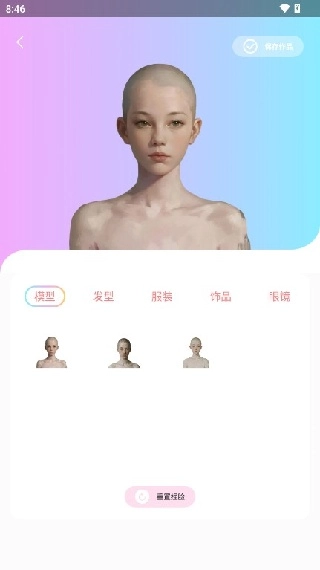 4. 點(diǎn)進(jìn)后可依據(jù)喜好選擇發(fā)型、服裝、飾品等,選好后點(diǎn)擊保存作品即可;