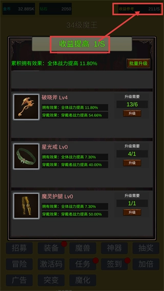 3、裝備完成升級后,會觸發(fā)“每秒收益增加1”的效果,頂部的【收益參考】數(shù)值將從每秒198提升到每秒211,與此同時,全體戰(zhàn)力的加成也會隨之同步增長。