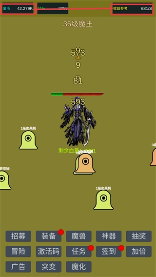 1、挑戰(zhàn)【33級魔王】時,搭配1/2/3級史萊姆協(xié)同攻擊,同時關(guān)注頂部【金幣】【鉆石】資源。
