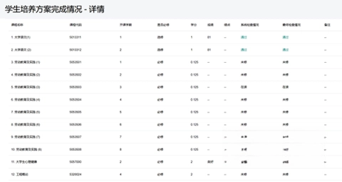 2、在此找到“培養(yǎng)方案完成情況”,可以看到所有科目的考試成績(jī),分?jǐn)?shù)≥60分或標(biāo)記為合格即為通過。