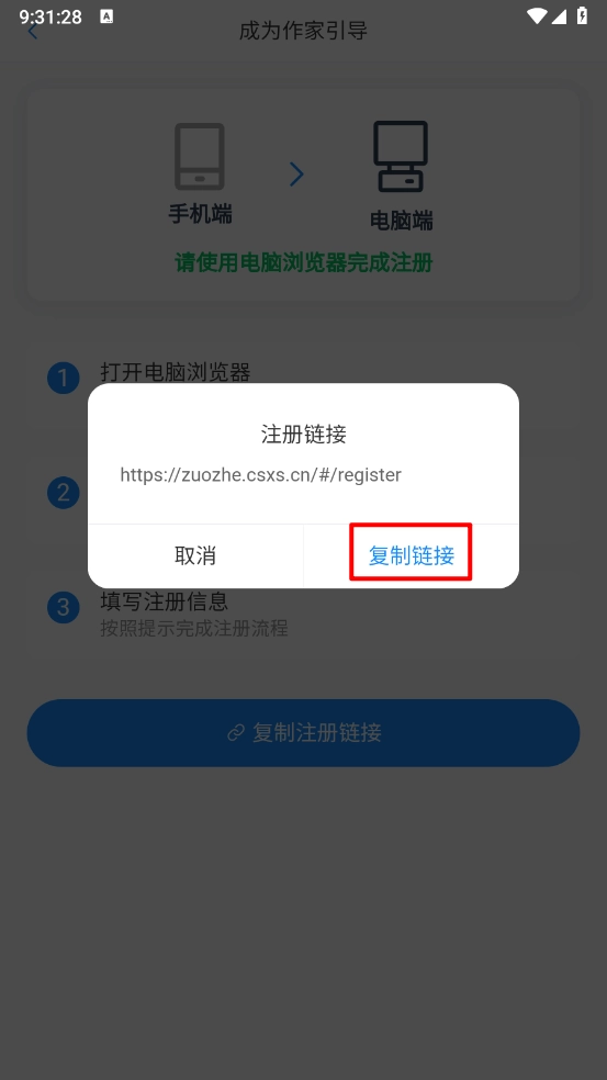 4、按照?qǐng)D示操作,彈出對(duì)應(yīng)的彈框后,點(diǎn)擊其中的“注冊(cè)鏈接”,隨后在電腦瀏覽器里填寫(xiě)相關(guān)信息完成注冊(cè)就可以了。