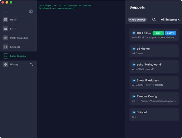 5、支持在不同終端調(diào)用代碼片段(Snippets),用戶可將常用命令預(yù)先保存,后續(xù)只需一鍵輸入即可快速調(diào)用長(zhǎng)命令,從而有效提升寫作效率。