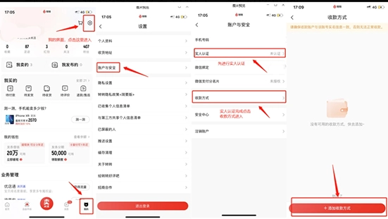 若要添加收款方式,可在應(yīng)用設(shè)置頁面里的“賬戶與安全”選項(xiàng)中操作設(shè)置。
