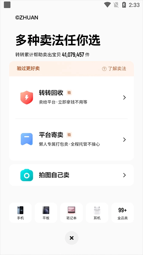 轉(zhuǎn)轉(zhuǎn)二手交易平臺是一款備受歡迎的二手商品在線交易應(yīng)用,為用戶提供手機(jī)高價(jià)回收、舊衣回收、二手?jǐn)?shù)碼電腦及正品潮服等多品類回收服務(wù)。平臺配備專業(yè)的驗(yàn)機(jī)質(zhì)檢團(tuán)隊(duì),由資深工程師進(jìn)行全方位檢測與估價(jià),實(shí)用性強(qiáng),有需求的用戶可在此平臺體驗(yàn)使用。