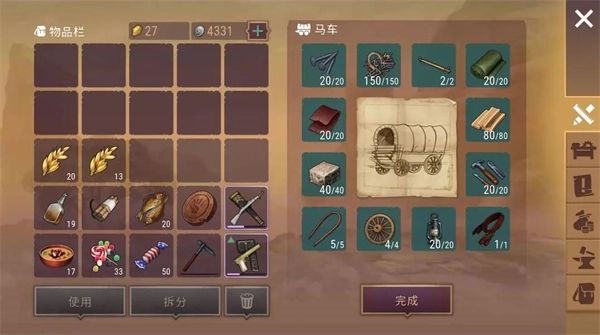 每次升級時,先別點前面那幾個選項,優(yōu)先點最后一個加精神值的,等精神值到80之后,再考慮點其他的。前期要多收集一級木頭、一級石頭和玉米。馬車的制作材料只能從槍戰(zhàn)地點獲取,或者通過“歹徒之怒”事件——也就是干掉來抄家的歹徒后,摸一下掉落物,如果拿到藏寶圖,就馬上前往藏寶地點,有一定概率能找到馬車材料。