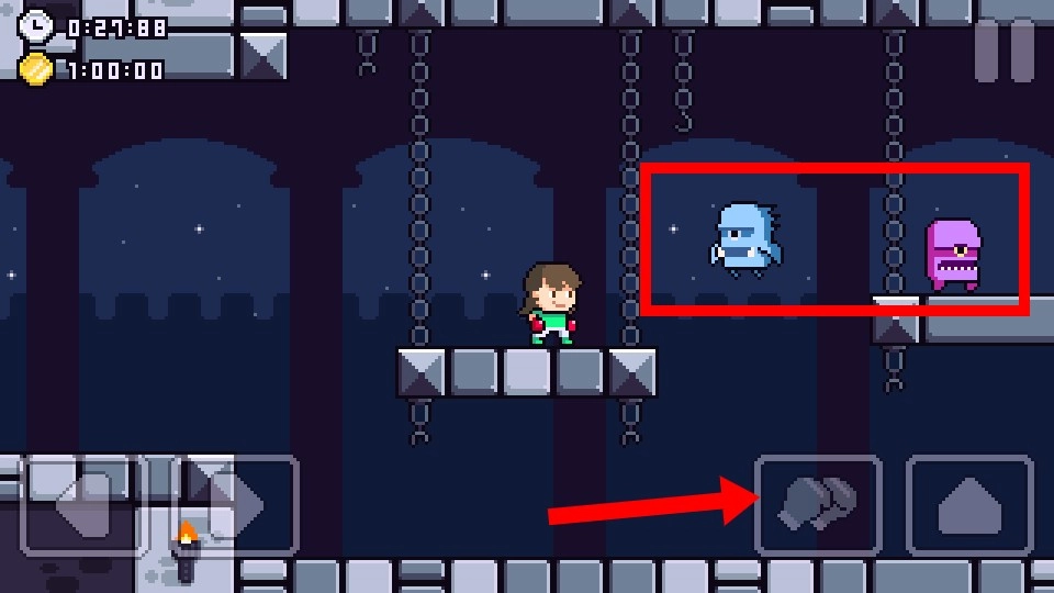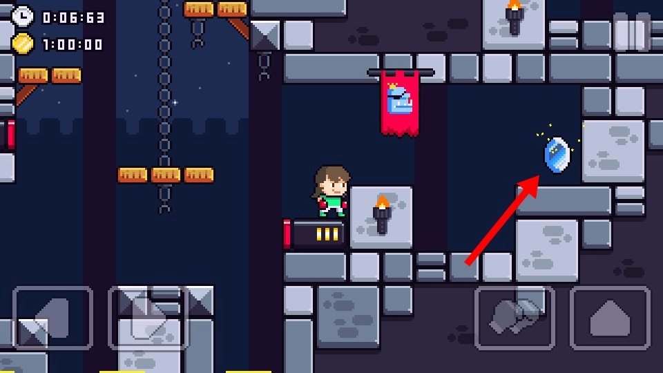 進入游戲關卡后,借助左下角紅框里的【方向鍵】與右下角的【跳躍鍵】,移動到紅標所在的位置。