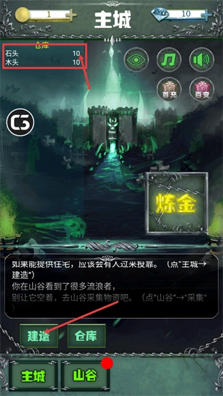 查看【倉庫】能了解到目前有【石頭-10】【木頭-10】,點(diǎn)擊【建造】可以解鎖建筑,點(diǎn)擊【山谷】能夠采集更多物資。