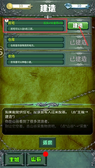 在【建造】界面,消耗【石頭-10】【金幣-10】來建造【民宅】,這座建筑能夠容納5名工匠入駐,為后續(xù)的資源生產(chǎn)提供助力。