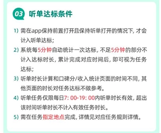 聽單任務(wù)的有效時(shí)長僅統(tǒng)計(jì)每日7:00至19:00期間的聽單時(shí)長,在此時(shí)間段之外的聽單時(shí)長不納入有效任務(wù)時(shí)長計(jì)算。