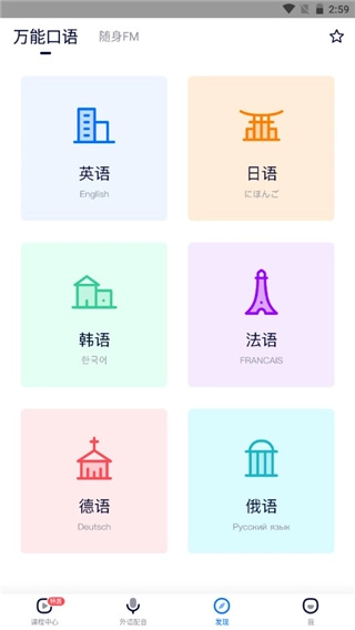 在發(fā)現(xiàn)頁面里,有適合學(xué)習(xí)萬能口語的內(nèi)容,像旅游、面試、交流等不同類型的都能找到。