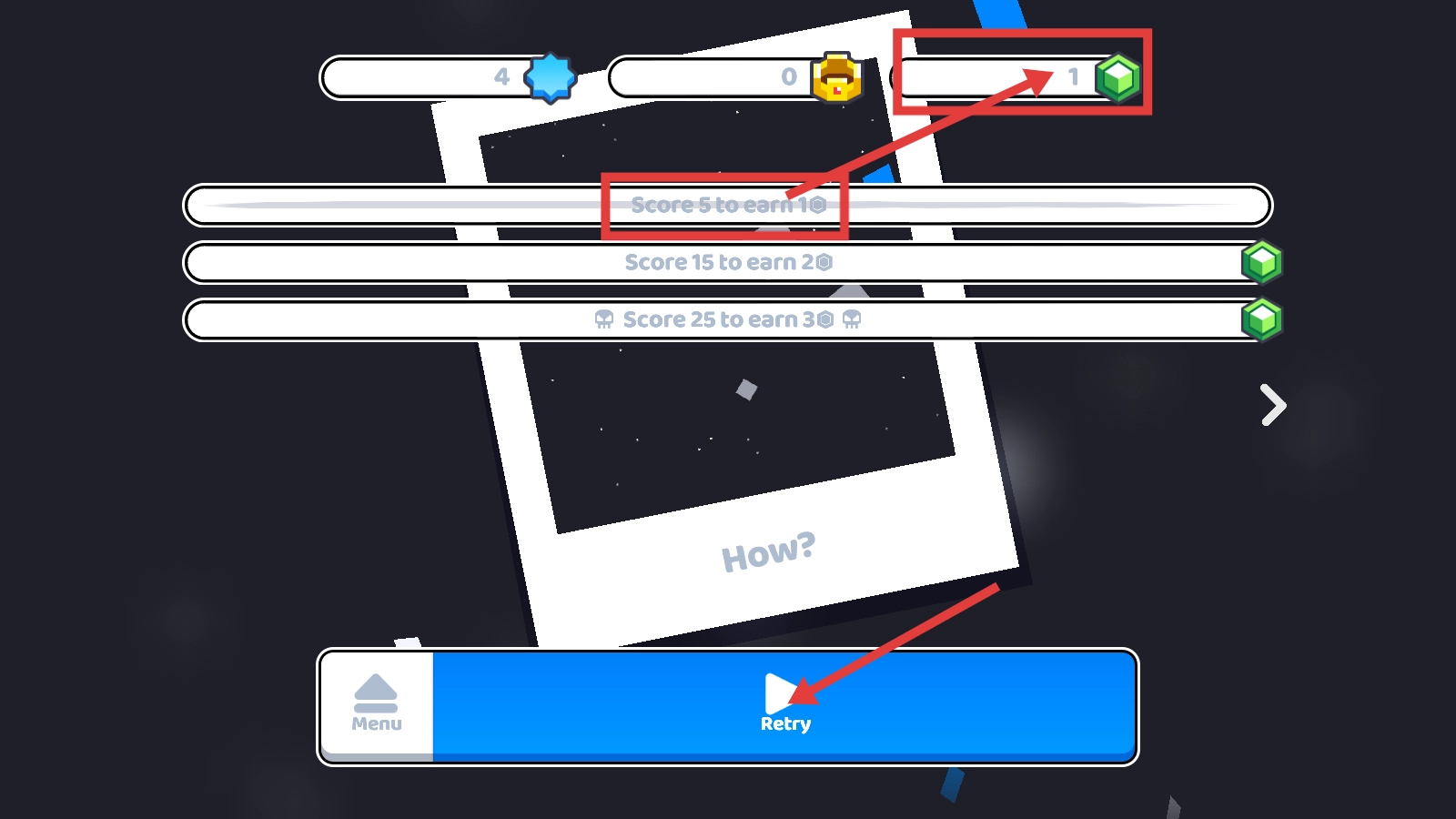 完成挑戰(zhàn)后,你可以點(diǎn)擊【Retry】按鈕重新嘗試,還能查看【Score-5-to-earn-1?】之類的獎(jiǎng)勵(lì)進(jìn)度,以此來積累綠色寶石資源。