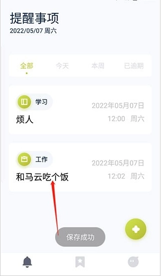 點擊保存后,系統(tǒng)會自動跳轉至提醒事項界面,在該界面中我們能夠看到剛才設置好的提醒事項。